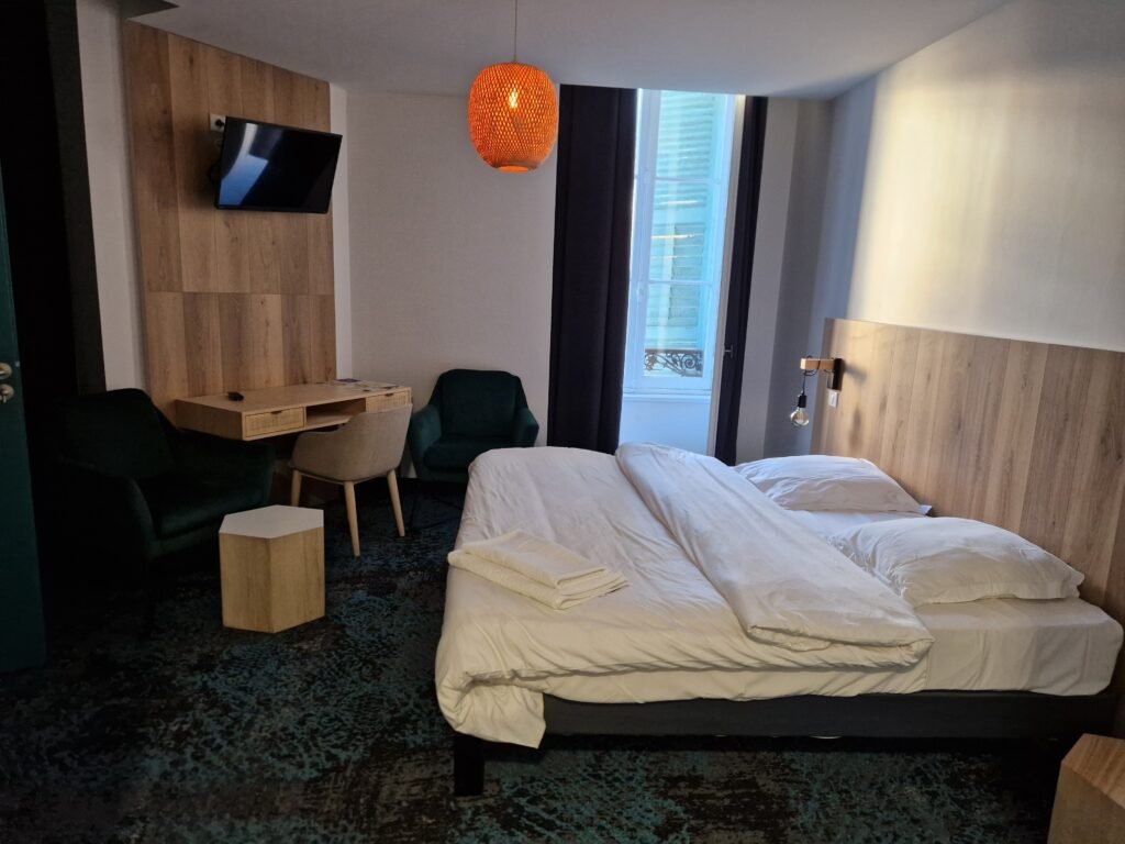 Notre chambre triple de 35 m² allie confort et modernité pour accueillir jusqu’à trois personnes. Entièrement rénovée et isolée phoniquement, elle offre un cadre calme et reposant. Elle se compose d’un lit king-size spacieux et d’un lit simple, parfaits pour un séjour en famille, entre amis ou lors d’un voyage d’affaires. Son aménagement contemporain et son insonorisation garantissent à chacun une nuit paisible dans un espace convivial et lumineux.